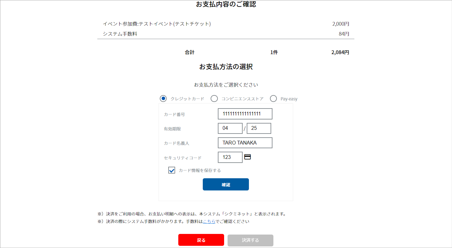 ③クレジットカード情報を入力し、「確認」をクリックします。
